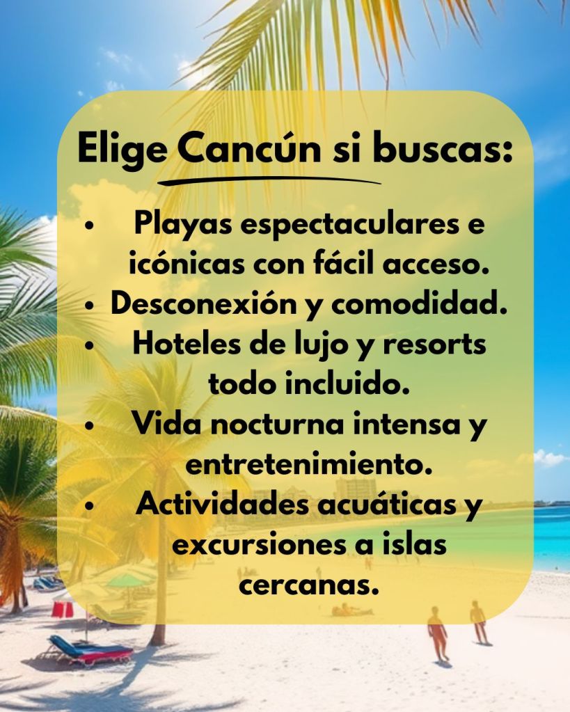 Tanto Cancún como la Riviera Maya ofrecen playas paradisíacas, actividades únicas y experiencias inolvidables, pero cada destino tiene su estilo: Cancún para quienes buscan comodidad, fiesta y resorts de lujo, y la Riviera Maya quienes prefieren naturaleza, tranquilidad y aventura.